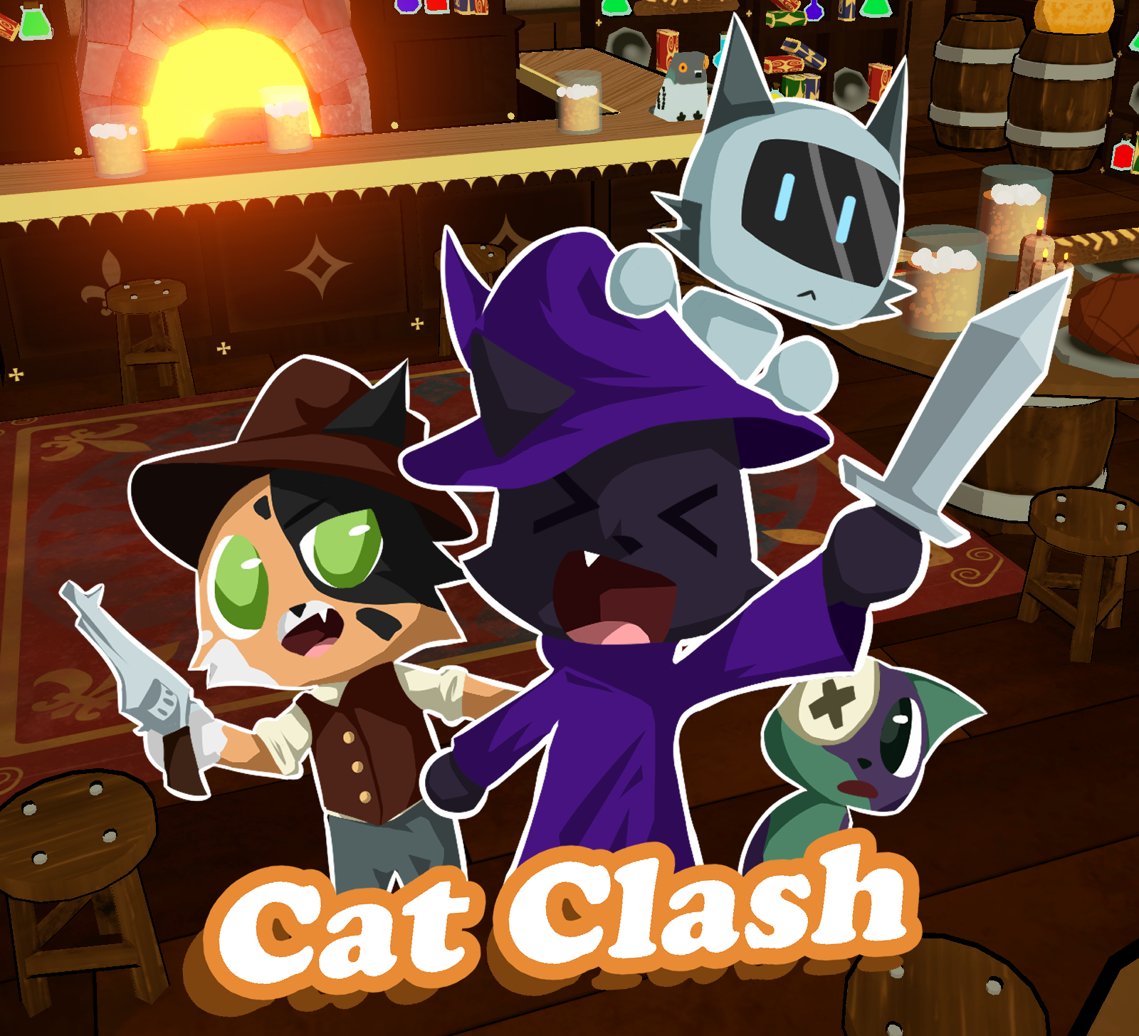 Cat clash is een chaotische tavern-brawler waar katten tegen elkaar vechten. Gebruik je revolver, magic, een laser of kots om andere spelers te verslaan, en om uiteindelijk te winnen.